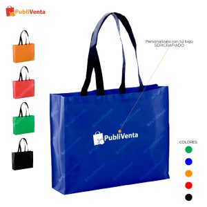 Imagen referencial*Bolsa en non-woven de 100g/m2, en variada gama de vivos colores. Con asas largas de 70cm en color negro, fuelle reforzado con ribete a juego y acabado cosido.- Composición