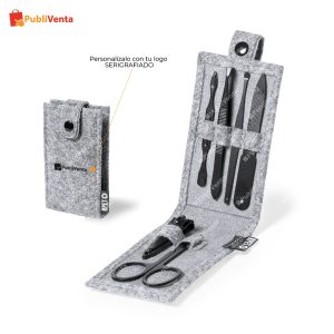 Set de manicura de 6 accesorios, con funda fabricada en resistente fieltro RPET, fruto de la combinación del proceso de reciclaje de materiales plásticos junto con la técnica milenaria de fabricación del fieltro, dando como resultado un material de eco-tendencia que, además de ser de origen reciclado, también se convierte en reciclable. Accesorios metálicos en acero inox de acabado negro: tijeras, pinzas, cortaúñas, lima y 2 quitacutículas. Con cierre de botón y etiqueta distintiva RPET en exterior. 6 Accesorios- Especificaciones artículo: 11 cm / 6 cm / 2 cm | 55 gr