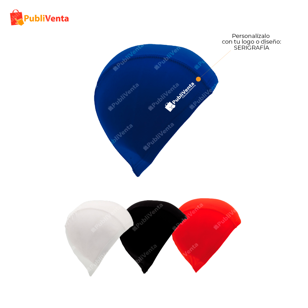 Gorro para piscina en material spandex de vivos colores que proporciona un sólido y suave ajuste en la cabeza.