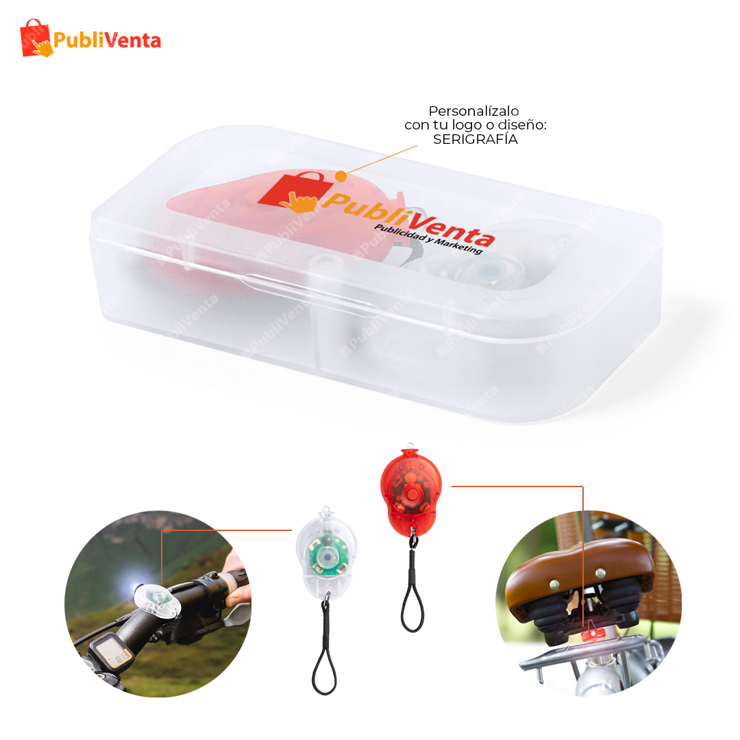 Set de luces de seguridad led para bici. Incluye 2 piezas, con dos posiciones de luz y presentadas en resistente estuche individual con cierre magnético. Alimentación a pilas de botón (incluidas). 2 Piezas. 1 Led. 2 Posiciones de Luz, Fija e Intermitente. Pilas Botón Incluidas